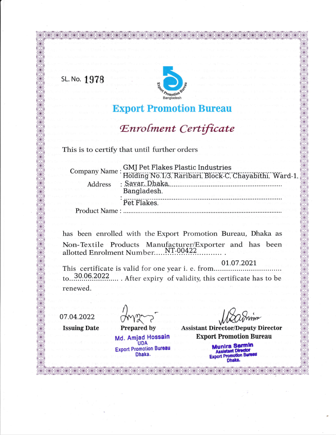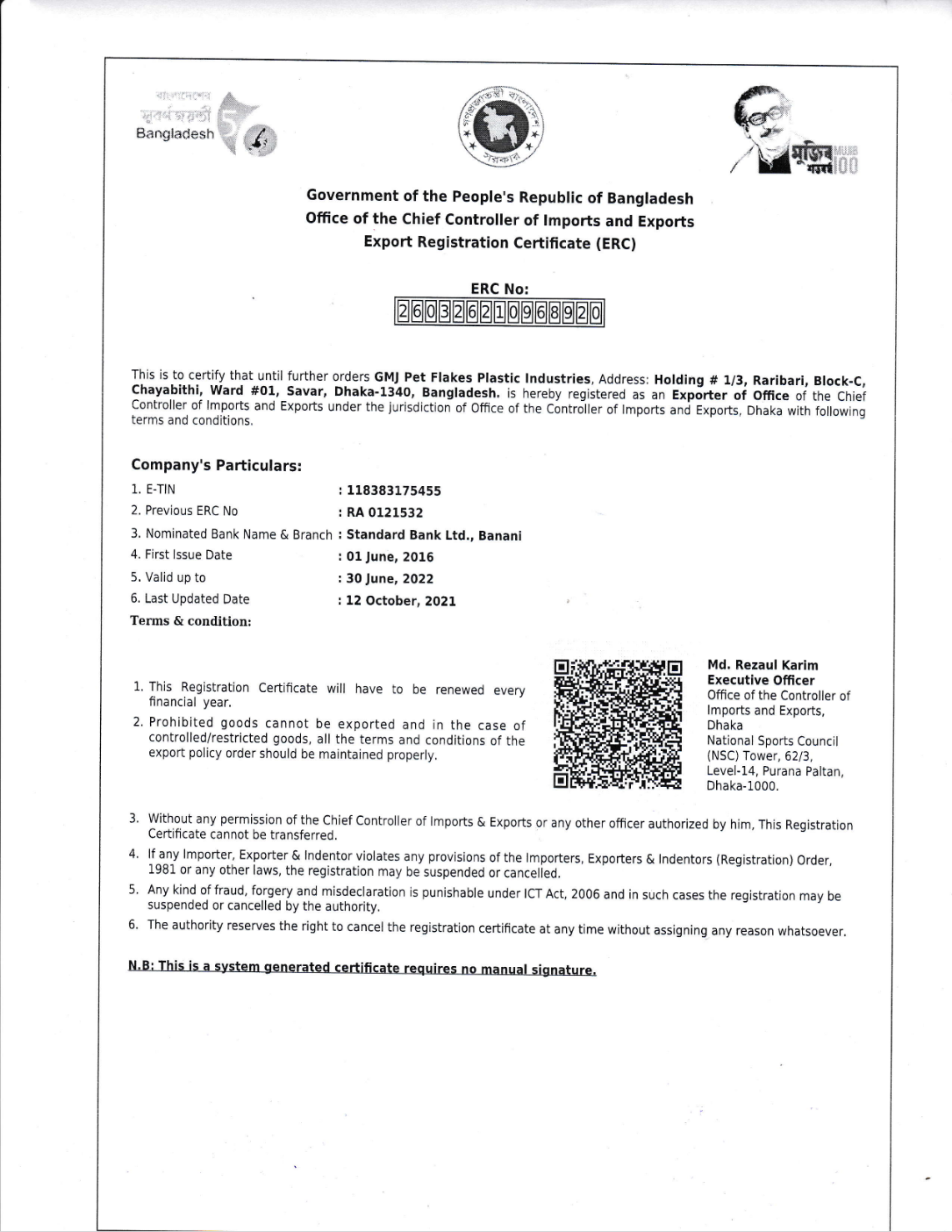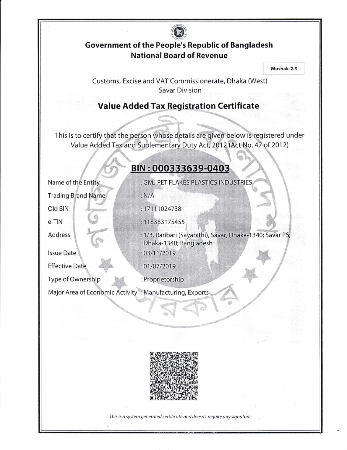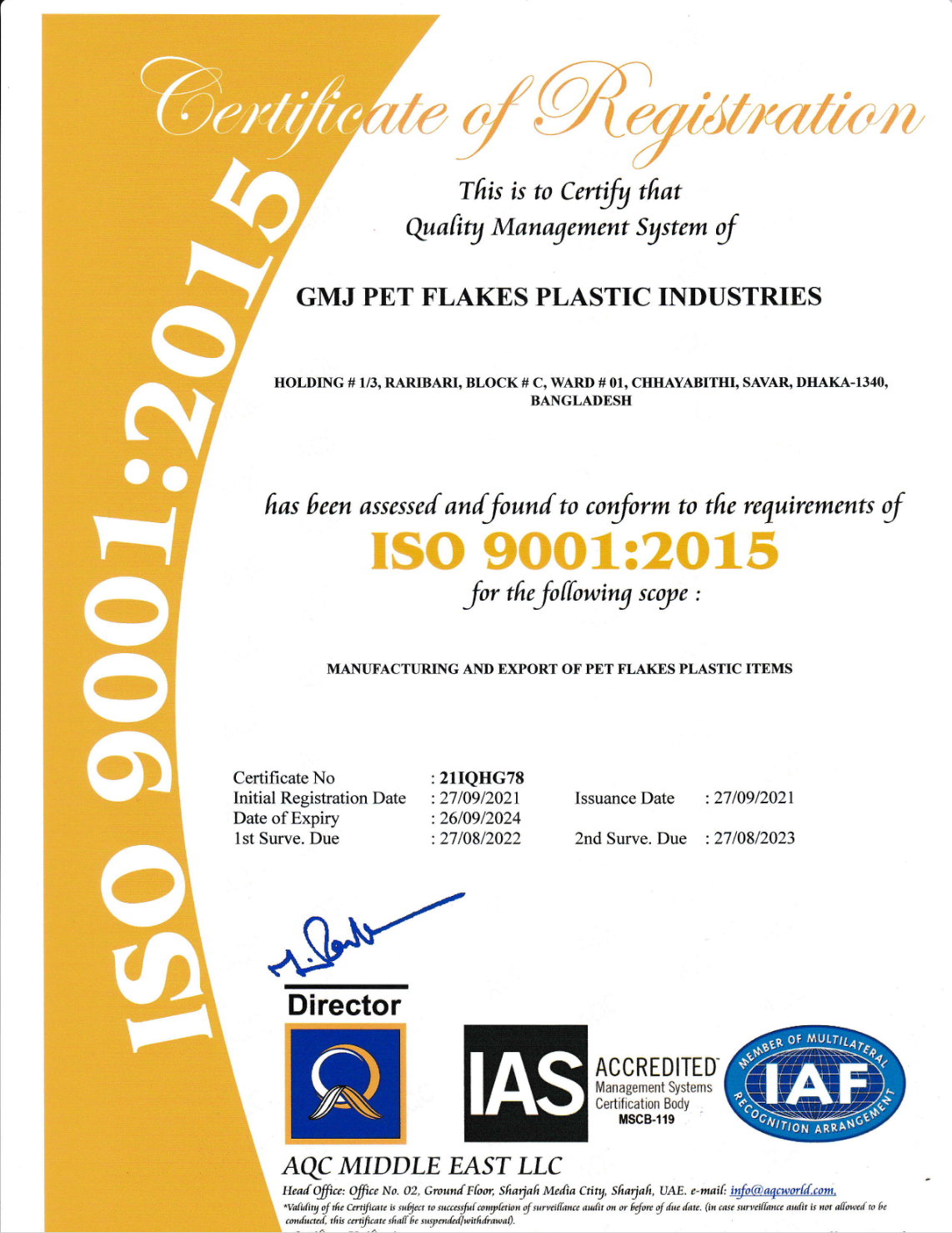 ISO ISO ISO ISO Others TRADE LICENCE Ertrofment Certfficate Expoft Registration Certificate (ERC) Value Added Tax Registration Certificate Best Recycled Plastic Exporter Factory License Best Exporter 2021